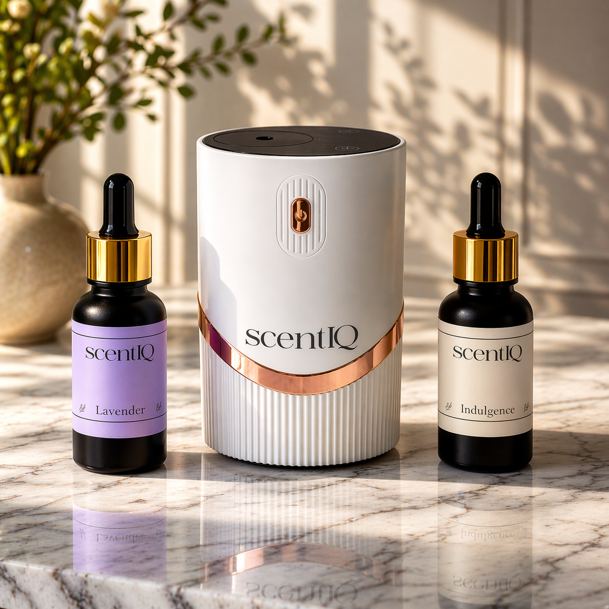 What's included — 1 × ScentIQ waterless diffuser (your choice of colour) — 2 × 20ml certified organic essential oils (your choice of scents)